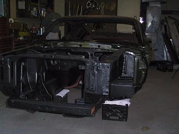 This picture was taken through the rear window opening. The firewall is ready for the dash to be installed.