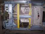 washer between the reaction plate and one of the frame rails to account for the paint thickness. I hope this doesn't turn out badly when the engine frames are finally installed. With the floor sections clamped in the correct location, I spot welded them together in a few locations and removed the floor from the tub. With the floor sitting on milkcrates I finished the spot welding. My spotwelder cound not reach the center 2 inches of the floor so I just welded the that section on both sides with my mig. | ||