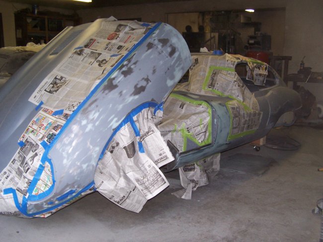 is that when you look down the side of the car, all of the panels are in perfect alignment. Once I was satisfied with the alignment, a couple coats of PPG DP50LF epoxy primer was applied.