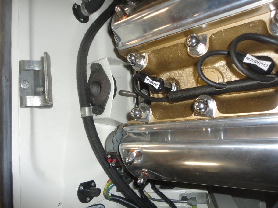 18) Here is the virtually completed engine compartment. The only thing missing in this photo is the hose clamps for the upper heater hose, the hose clamps for the timing cover vent hose,
