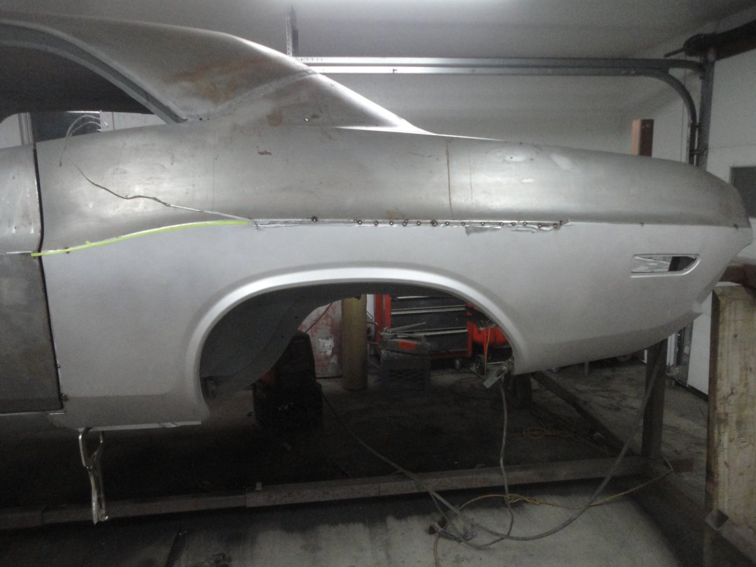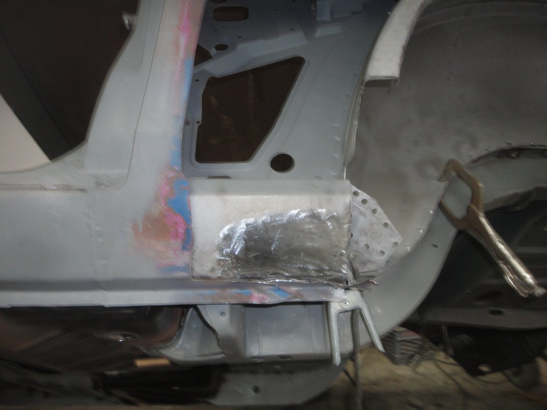78) For the front patch of the wheel well, I used a section of a new repo panel. Here it is welded in place just before the