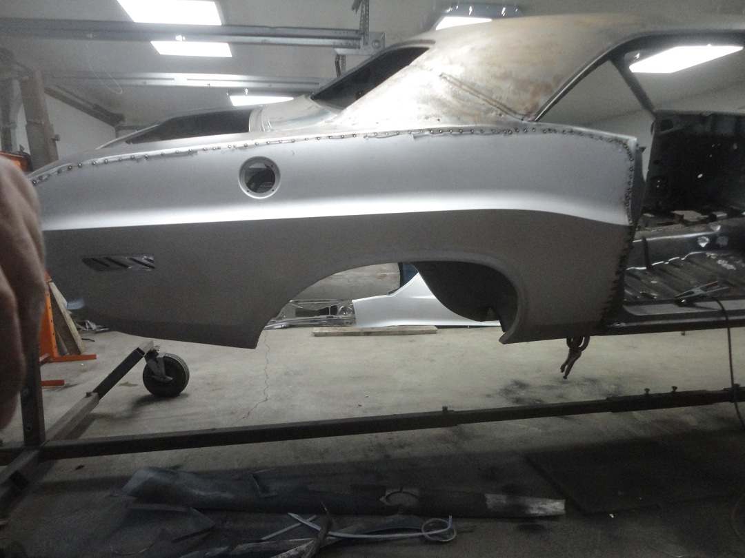 104) Here is a picture of my new Dynacorn rear quarter. The 4 holes for the gas filler were a bit undersized (which I corrected), but