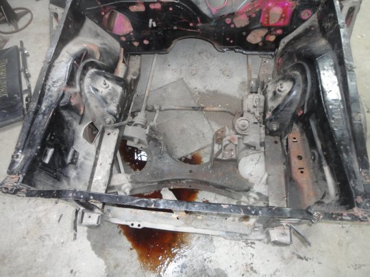 131) I sprayed some weldthru primer on the repairs to protect them from corrosion while I worked on the radiator support. I should mention that I test fitted the K-frame to ensure that things still lined up after the frame rail repair. I also compared measurements of the frame and compared them to the measurements in the service manual. Things still were in alignment. Wheh!