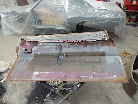 The passengers door actually had small rust holes at the bottom front and it also had a big crease down the middle from a prior accident. rust holes started to form at the very front on the inner door frame as well. The best way to repair the door was to reskin it. With the old skin off the inner door frame was sandblasted, repaired and primed on the inside.