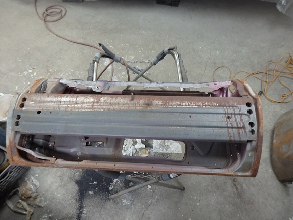 161) I started by taking a bunch of pictures of the seams on along the inside of the door since I would need to duplicate the original factory look. Once done, it was a matter of taking a die grinder to grind the fold along the parimeter of the door. The top was held in place with spot welds, so I just ground those down until the metal was thin enough to break them free with a putty knife.