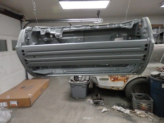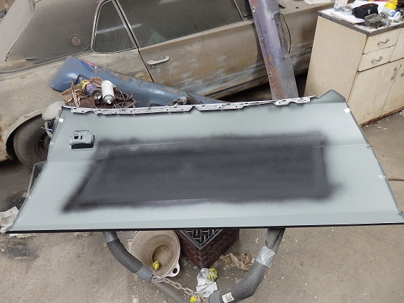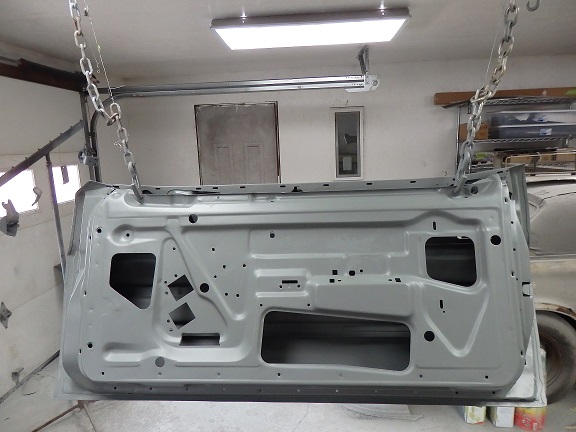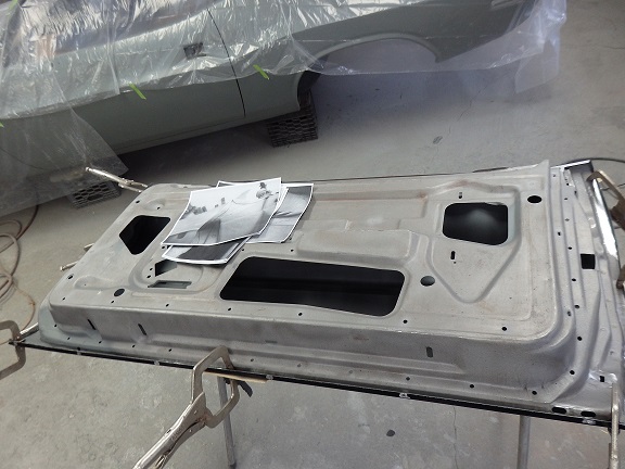 164) I also primed and undercoated the inside face of the new AMD door skin. Youu can see bare metal spots along the perimeter of the skin. This is because the door skins were to be spotwelded in place like the factory originally did it.