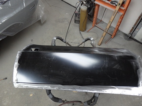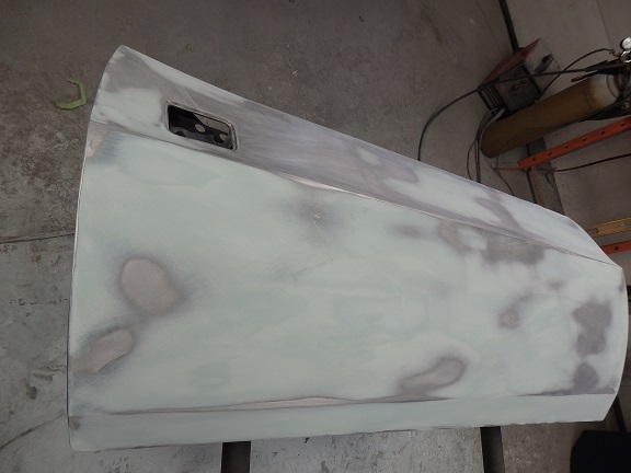 172) Here is the door ready for primer. It looks like there is a lot of filler on the door, but it is very thin. Most of the imperfections could have been taken care of in the highbuild primer stage, but I like to catch any series imperfection at this stage.