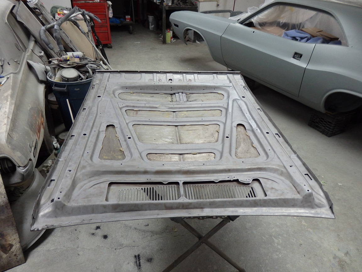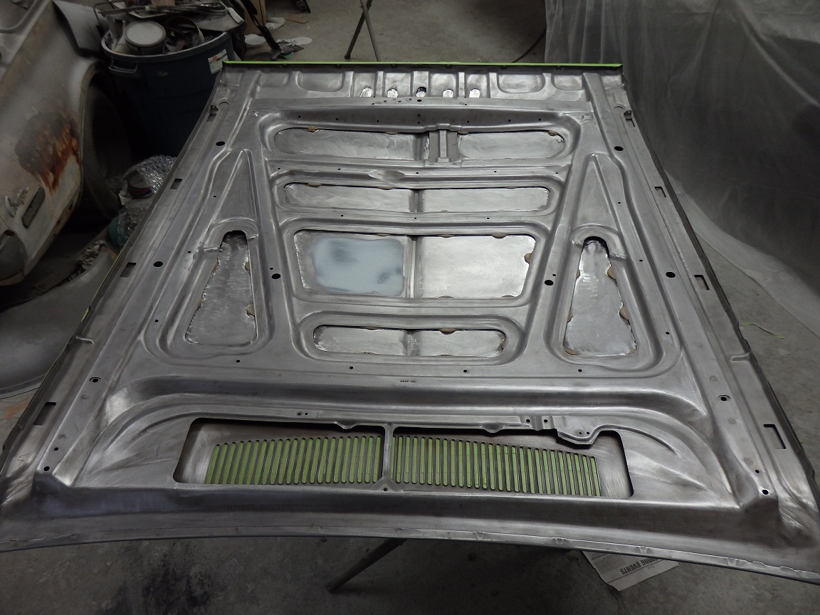 192) The top side of the hood was chemically stripped with Aircraft Paint Stripper. I have yet to see a perfect hood. People who sit on their hoods create a lot of work for people down the road. Though this picture makes the hood look terrible, most of filler was not very thick. I could have skipped most of it and waited for the highbuild primer step to take out the imperfections.