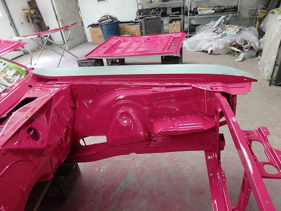 230) Lastly the undercarriage was oversprayed with Panther Pink paint. I tried to replicate what the undercarriage overspray actaully looked like for this car. Technically I'm not done with the undercarriage. Originally the rocker panel pinchwelds were blacked out producing some black overspray over the pink. I am holding off with the blackout until the car is fully painted and buffed. Then I will apply the backout for the radiator support, windshield opening and rockers all at the same time.