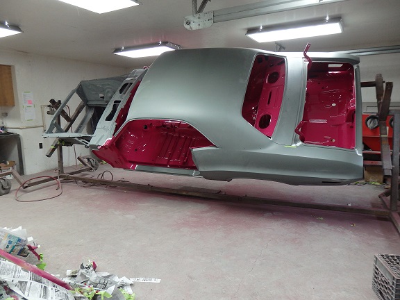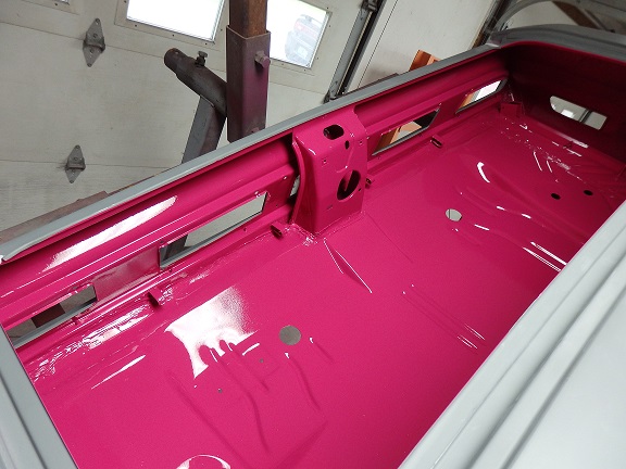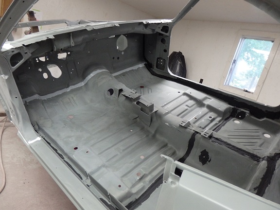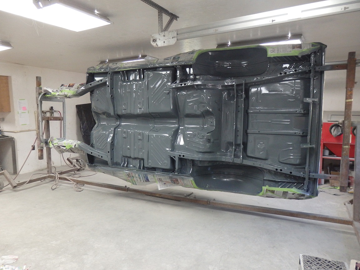 228) And at last there was paint! Originally the factory would have dipped the car half way up its side in a vat of water soluable gray primer (dip gray). The primer on the outside of the car was then hosed off before the primer was baked on. In the end the primer is only visibly from the undercarriage.