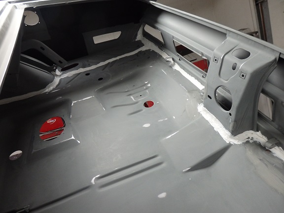 The rest of the interior floor was sealed with Black Jack Neoprene Super Flash Cement, which I bought at Lowes. It replicates the original factory sealer very closely and is easy to work with. I used 4 tubes to do the entire car.