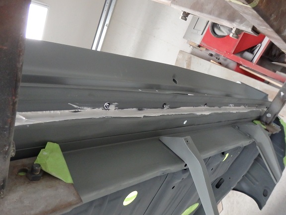 229) The next thing the factory did was to coat the outside panels with red oxide primer. This was baked on and then the outside panels were coated with a light gray primer prior to painting. To replicate this I shot DP74LF along the masked rocker panels to simuldate the overspray. Then I shot some tinted DP40LF to match the factory gray.