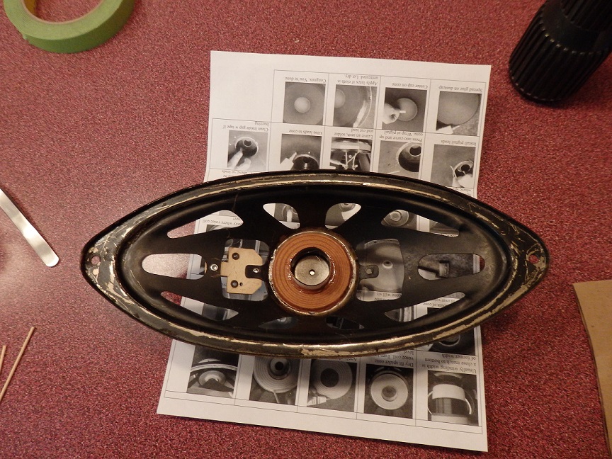 Reconing was quite simple. The first picture shows the original speaker with the cone removed. The second pictures shows it while the glue was curing after I replaced the voice coil
