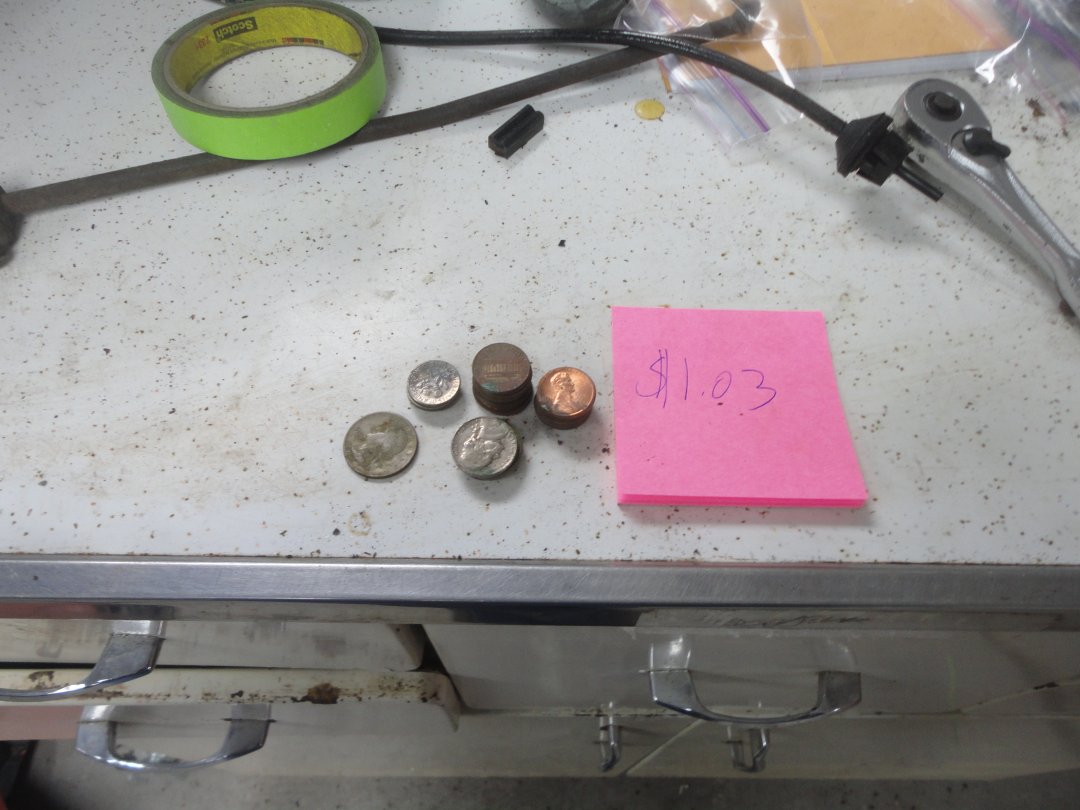 The last picture shows all of the change I found when taking the car apart. $1.03 is better than nothing. I also found an earing, comb and three empty boxes of Dynamints. Are there any collectors out there?