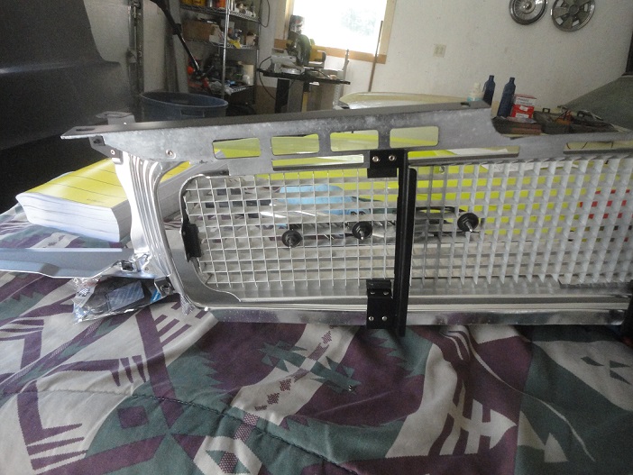 384) I was able to rebuild the grill with new repo pieces that I got from Roseville Moparts. Luckily I had the missing bracket on the original hood latch support.