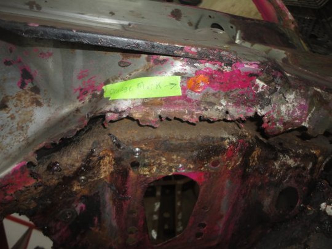 13) I was very lucky to discover an original factory inspection mark (orange). I will faithfully reproduce this after the car is painted.