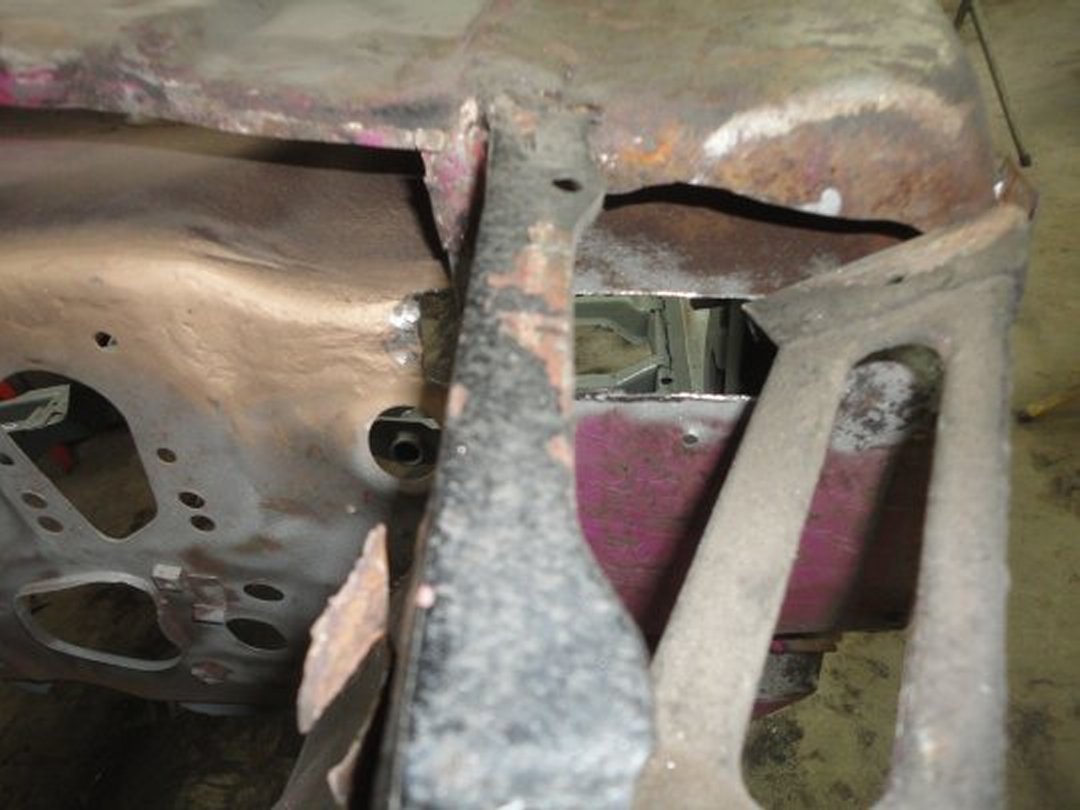9) The first actual repair was the area shown here on the left rear frame rail. I had to cut part of the rear reenforcement off to get to one