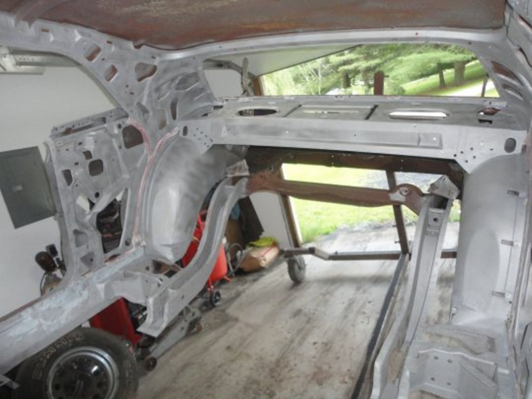 3) I stopped sandblasting at the upper rear crossmember. It is actually quicker to replace the crossmember than to sandblast, prime and fill in
