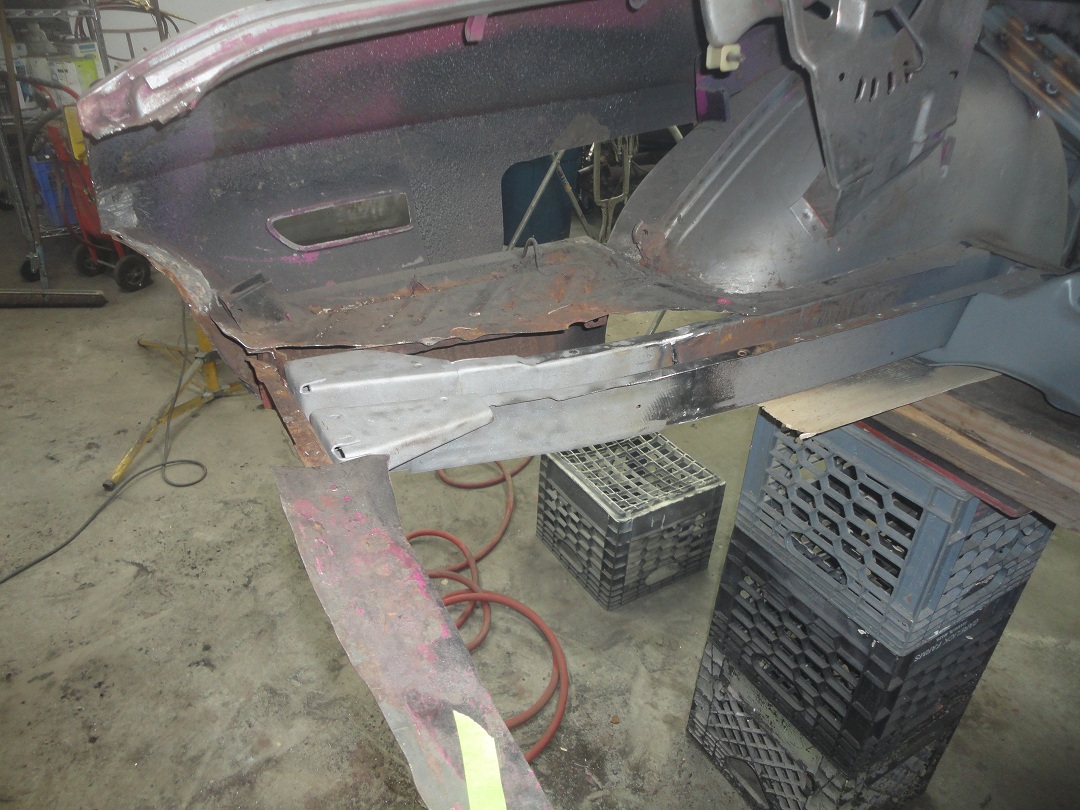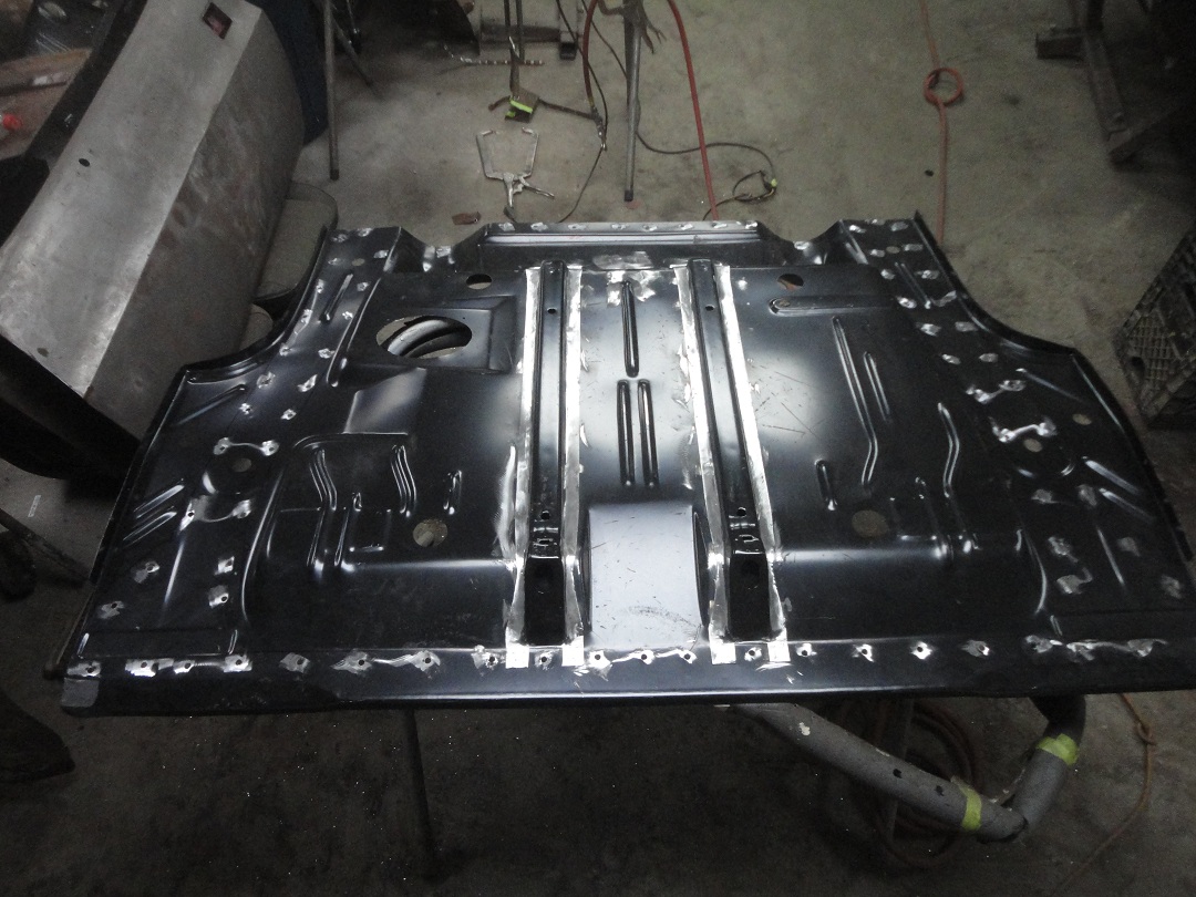 63) Here is the trunk pan all welded in with the welds ground down. The only real difficulty was getting the front
