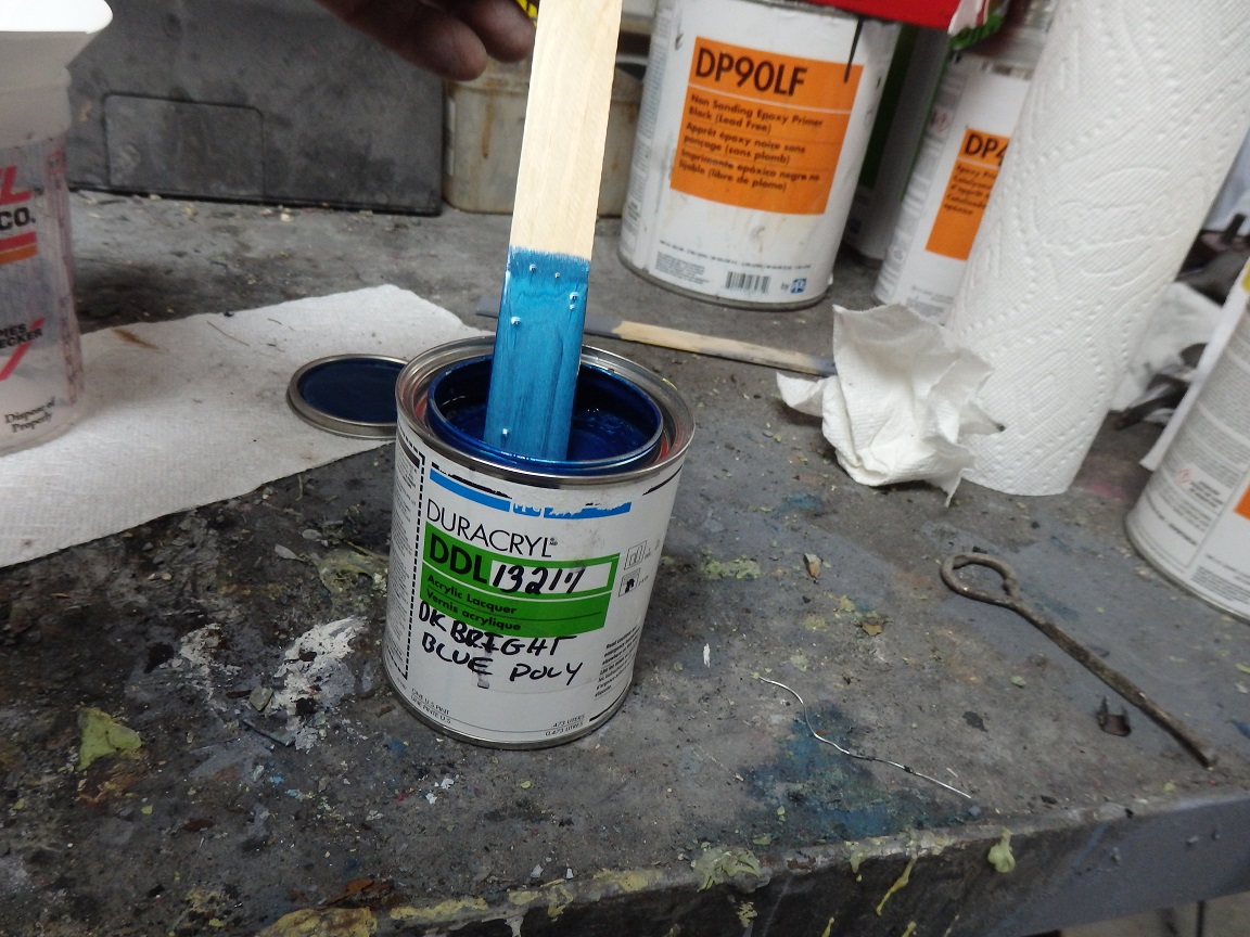 The next thing to get painted was the dash face and the top of the door and rear quarter frames. This is supposed to be PPG 13379, which is a medium blue that is lighter than the interior upholstery. I ordered a pint from Instrument Specialities and applied the paint, but probably shouldn't have. As it turned out the paint was the wrong color as you can see in the first 2 pictures. The first pictures shows an original trim piece, the PPG paint chip for 13379 and the glove box hinge I painted. The new paint didn't match the chip because it was mixed to the old formulas that were never updated when the newer lacquer pigments were updated. Instrument Specialities tried to help, but it was taking longer than I had time for. Luckily OER interior lacquer paint PP804 was close enough to the original color. Unfortunately it only comes in aerosol cans, which don't really spray out onto large panels very well. What I did to over come this was drain 4 aerosol cans into a pint can by poking holes in them. Then I was able to respray everything with my paint gun. |