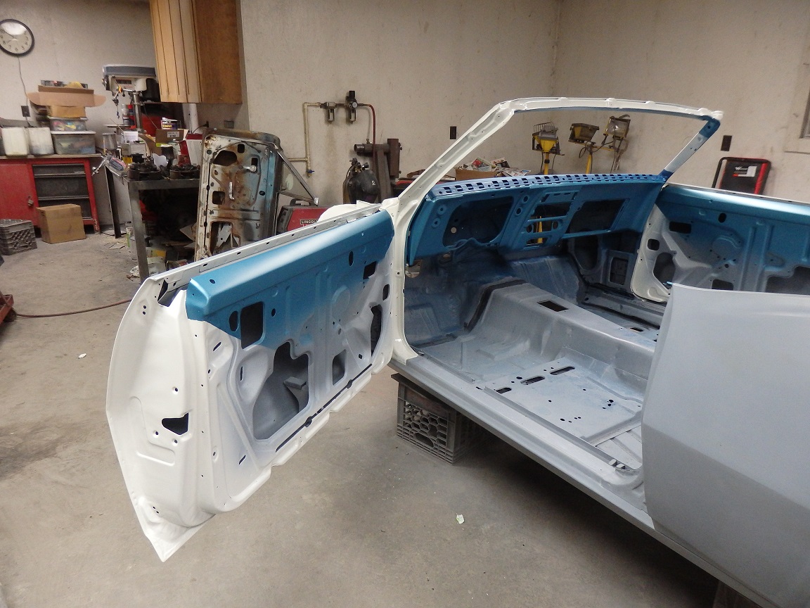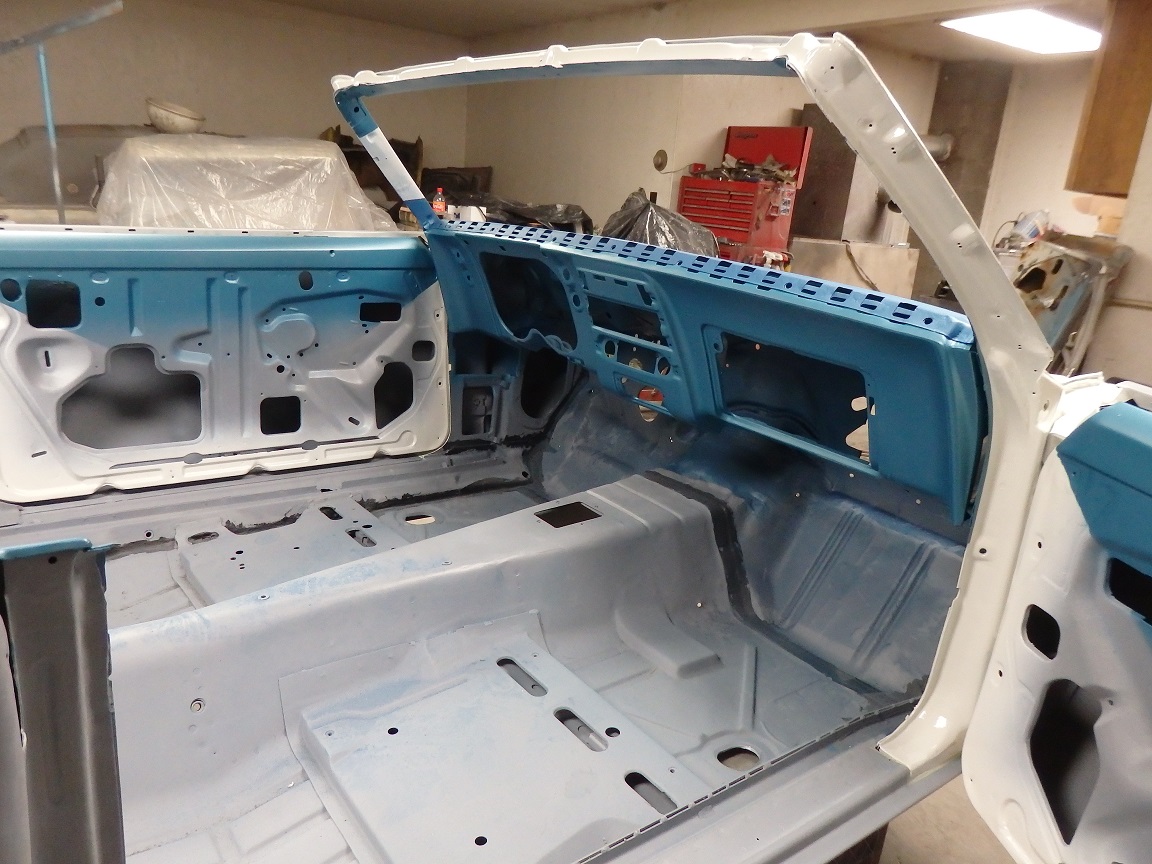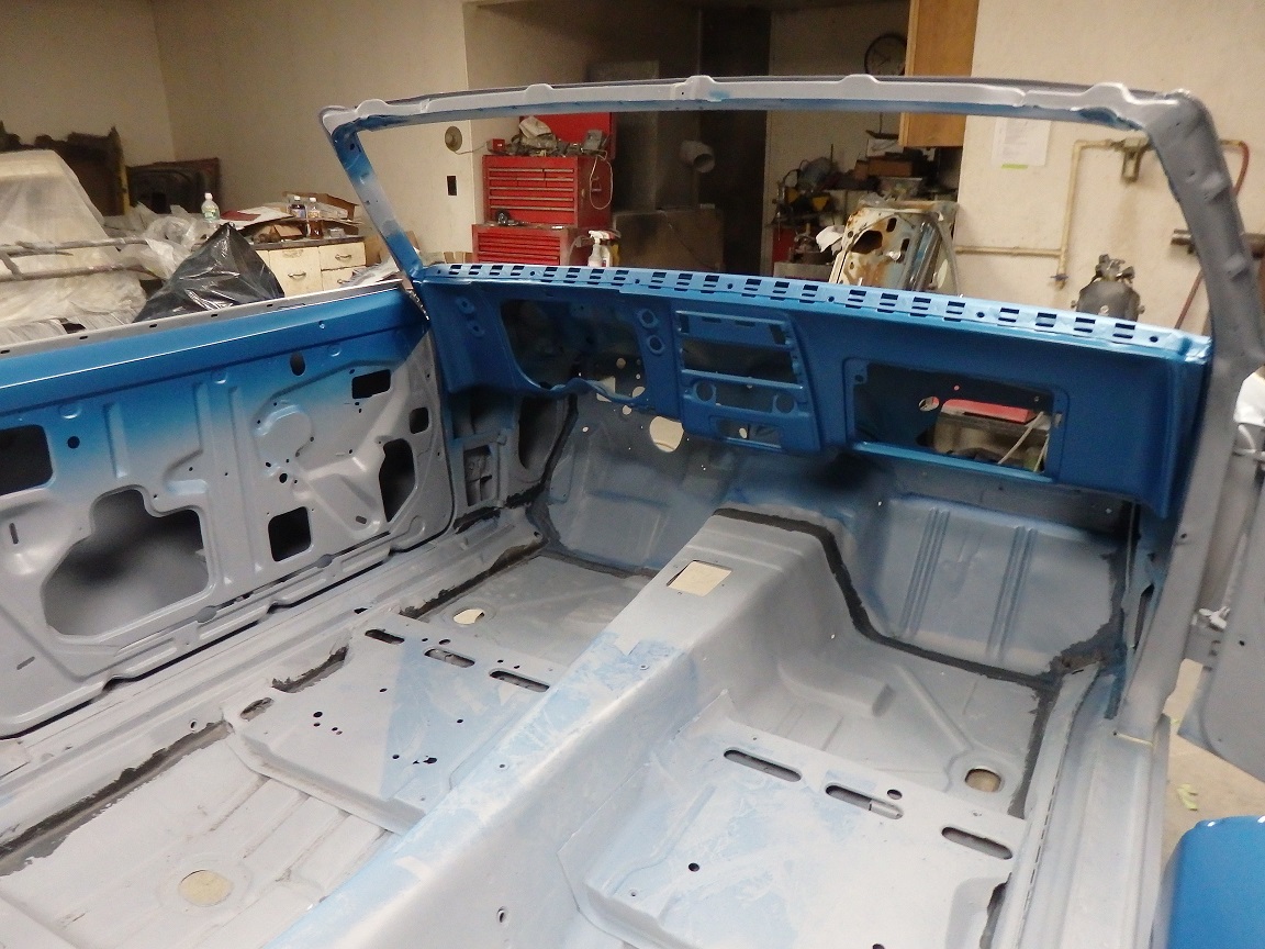 With the body off the rotisserie, the finish paint work could begin starting with the dash top. The top of the dash is PPG 13217, which is a dark blue lacquer paint with a suede additive. This could not be bought local anymore since lacquers are a thing of the past. However, I was able to have a pint mixed Instrument Specialities. I think the color came out great. It is a darker blue than the rest of the interior paint. It is supposed to match the dash pad, which is also darker than the rest of the interior. The suede additive gives the paint a nice texture and it holds down the glare. |