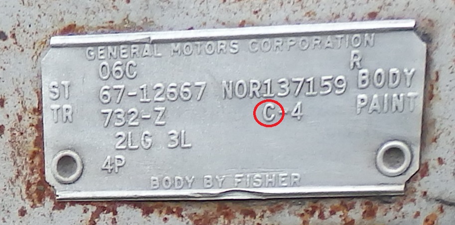 And finally the group 4 option, signified by the number "4" followed by the letter "P", which indicates that the car was originally equiped with an SS-350 (RPO L48) or the 327ci-275HP w/ Saginaw 4-speed transmisison (RPO L30/M20).
