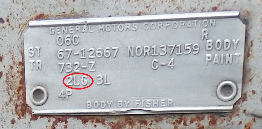 Starting with the group 2 options, signified by the number "2" followed by the letters "LG", the letter "L" indicates a 4-speed floor shifter Regular Production Option (RPO) M20 and the "G" indicates