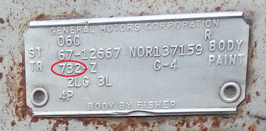 The code next to "TR" (for trim) tells you about the type of seats the car came with. "732" is the code for bright blue custom bucket seats. The "Z" indicates that the seats did not have