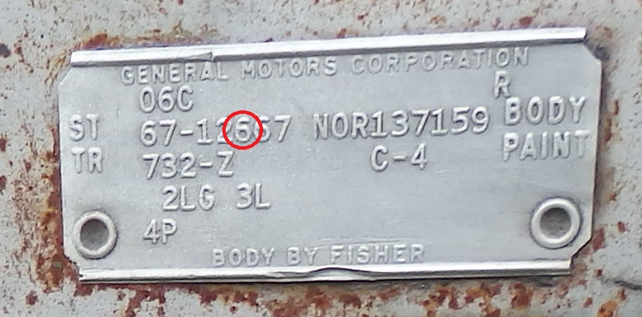 the model type, which is Camaro. The 3rd digit "6" after the "-" indicates the interior style, which is Custom (it would be a 4 if it had a standard interior). The last 2 digits "67" after the "-" indicates the body type,