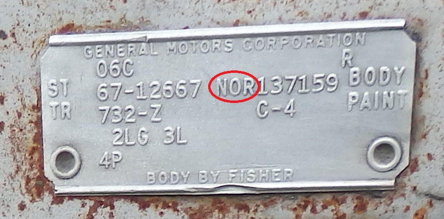 To translate the code in the upper right corner you have to indentify the plant where the car was produced. This is appears on the tag as an NOR for the Norwood, Ohio plant. It would have read LOS if it was built in the Los Angeles/Van Nuys plant.