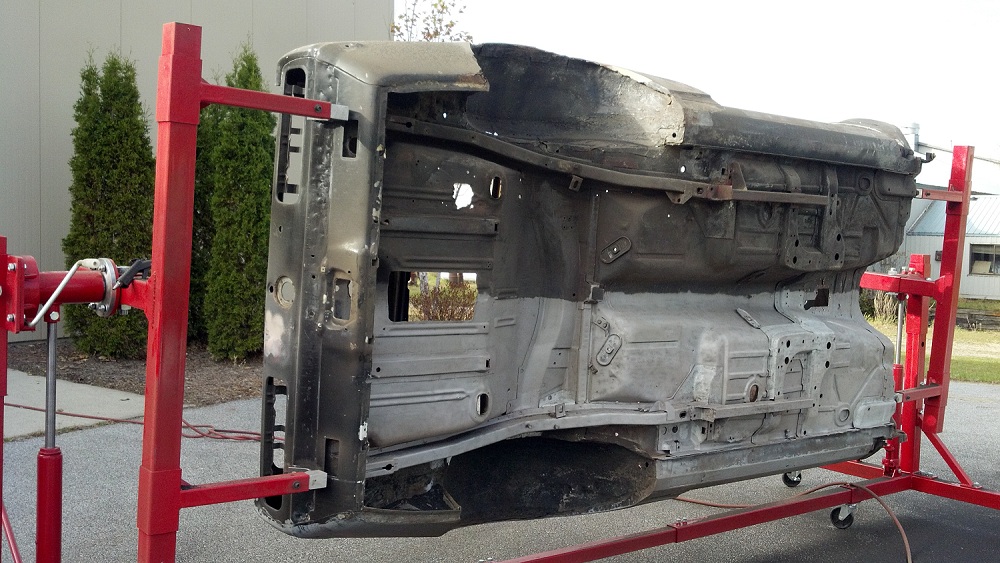 The second picture is what it first looked like when I put it on my rotisserie 2 years later. In this picture I had removed the frame reinforcements that were welded in to stiffer the car for drag racing.