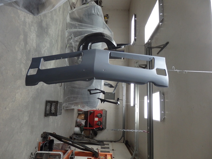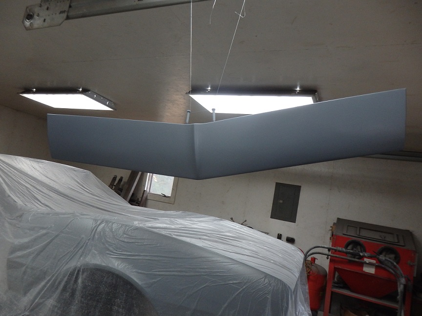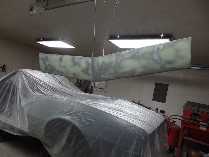 With the filler work completed, I hung it from the ceiling and primed it with epoxy primer.