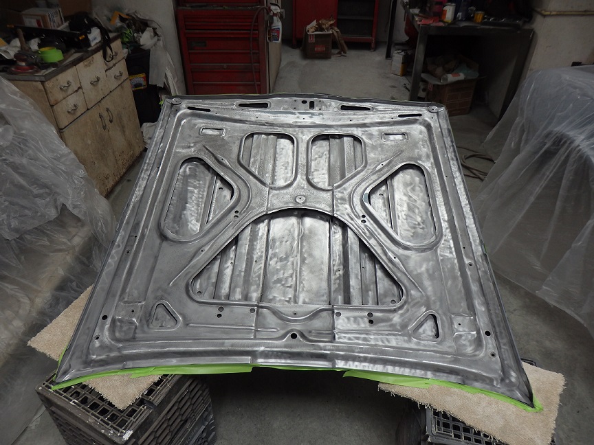 to the underside, which is common. However, there were some waves in the hood, which were probably due to people either sitting or standing on the hood. To strip the hood my blaster actually used corn.
