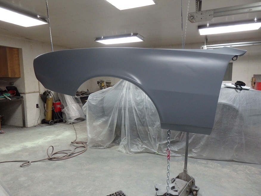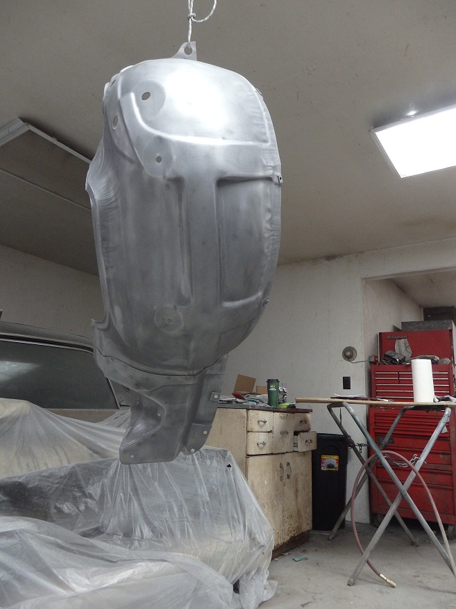 With the filler work completed, I hung the fender from the ceiling and epoxy primed the whole thing.
