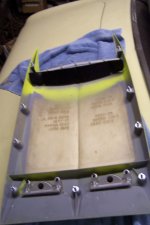 Here is the back side of the hood scoop. The fasteners are all new. The light housings were taken apart and cleaned. The outside of the housings where bead blasted and painted with Matte Nickle Rustoleum.