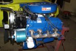 Here is the engine all together with the breather removed to show the heat stove pipe connections. Notice the alternator ? The redish stripe with the stampings in it