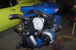 The fun part was mating the transmission to the engine. Though not shown very well in this picture, the transmission dipstick tube is a bright green, poppy green. The MCA judging rules state that the tube should be black, but from what I've see