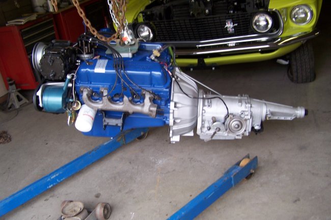 I temporarily wrapped a chain around the tailshaft to hold it level. Once the engine was positioned over the engine compartment, the chain was released. Then it was a matter of gradually lowering the engine a little and then moving the engine