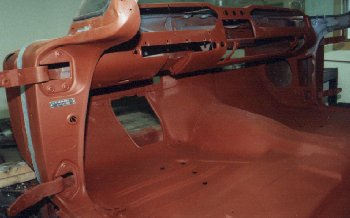 I primed the rust-free floorpan with red oxide primed, just like the factory originally did.