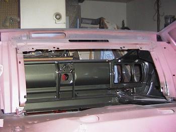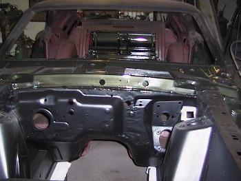 This picture was taken through the rear window opening. The firewall is ready for the dash to be installed.