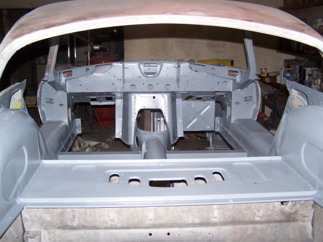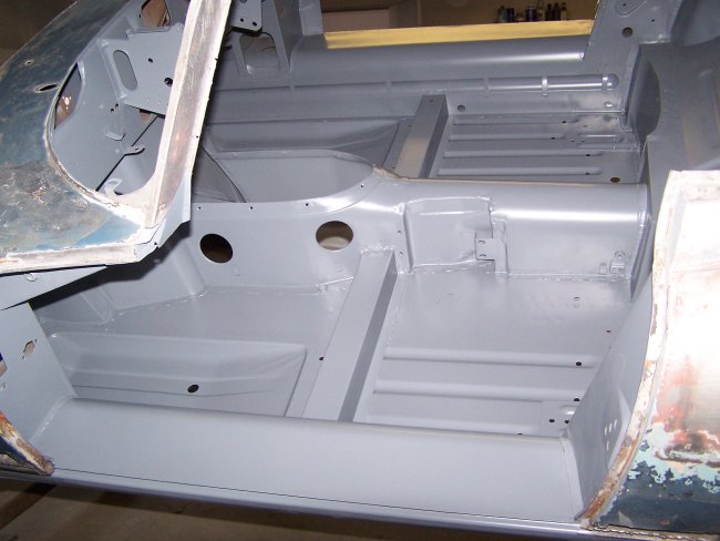 With the inner tocker panels installed the tub was ready for the floors. But first the interior was primed. The under dash area is hard to get at with the floors installed so this was the