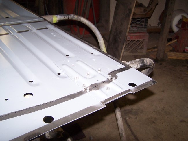 best opertunity to prime it thoroughly. Once the primer had dried I applied Wurth Body Wax to the inside of the floor reinforcements and on the mating floor sections prior to welding. The floor was clamped in place as before and was welded in using a combination of plug welding, bead welding and spot welding. Ideally I would have liked to have spot welded the entire floor in, but it would require a large investment in different tong styles for the spot welder. In the last picture above you can see a section of the underside that was primed and coated with body wax. This was done in preparation for a reinforcement that is welded across the transmission tunnel towards the rear of the car. | ||