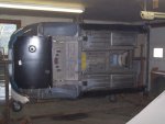 washer between the reaction plate and one of the frame rails to account for the paint thickness. I hope this doesn't turn out badly when the engine frames are finally installed. With the floor sections clamped in the correct location, I spot welded them together in a few locations and removed the floor from the tub. With the floor sitting on milkcrates I finished the spot welding. My spotwelder cound not reach the center 2 inches of the floor so I just welded the that section on both sides with my mig. | ||