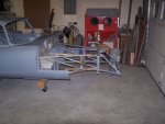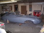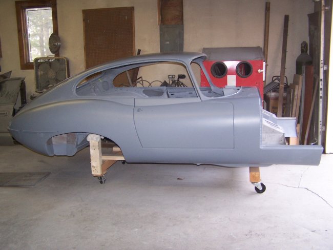 2x4s and some casters. I stapled some foam padding on the cart where it made contact with the shell.It took me a few hours to lower the body onto the cart. Then came the installation of the subframes, the picture frame and the bonent support frame. To prevent damaging the picture frame I had to install the lower A-arm front brackets (shown above). They are inserted into pockets inside the picture frame. If is installed the bonnet support frame without them, the pockets would have been deformed when I tightened the hardware. As you can see in the pictures one of the engine subframes has not been primed. I need to buy a new subframe for the right side. The original one was split at a joint in the front where someone had jacked the car up. There was also a rust hole by the pciture frame. E-type engine subframes can not be repaired. They are running about $1200 per side right now. At least the left side was perfect. | ||