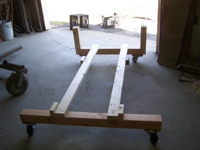 rockers and the seam between the rockers and the bonnet could be lead loaded. This can only be done with the body off the rotisserie. I built a cart to rest the shell on from a 2"X4"X8' and a couple