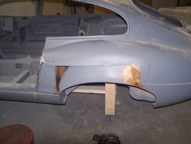 Since the joint at the rocker came out pretty even, I did not bother with lead on this side. I gave the whole panel a skim coat of Evercoat fiberglass filler, sanded it down and gave it a scratch