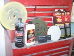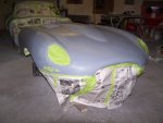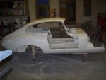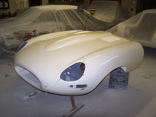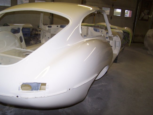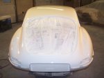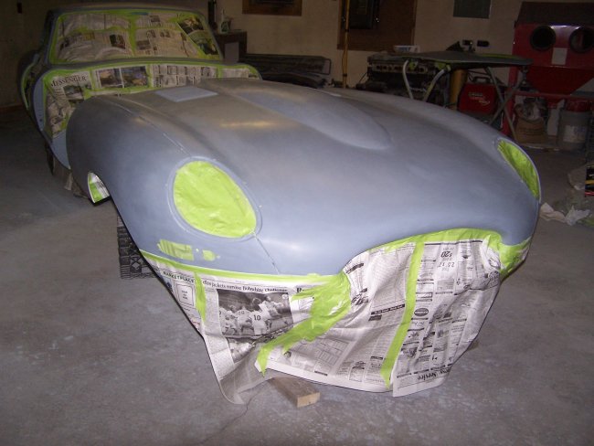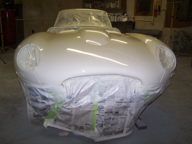 previously painted clean surfaces. It should be noted that the sanding juice (mixture of clear coat and water) when dried sticks to paint and is very hard to remove. I started by sanding the nibs (dust specs that produce bumps in the clear) down using 1200 grit paper on a foam sanding block and using soapy water. I actually had one run in the clear to fix on the bonnet (amazing there was only one in this curvy car) . This I took care of by blocking it down with 800 grit paper (wet) wrapped around a paint paddle. Being careful to only sand the run, I sanded it till it was almost gone. Then I took the rest of the run away using 1200 grit. I then sanded everything using 2000 grit Meguiars sandpaper wrapped around a semi-rigid foam sanding block. Sanding was done using warm soapy water. I wiped the panels dry with Bounce paper towels (because they are soft)as I went. The sanding was then repeated using 2500 grit Meguiars sandpaper. I probably have 7 hours into sanding the car by hand. At this point I normally start buffing the car starting with a high cutting 3M compound, but my brother suggested that I try the new 3M Trizact 3000P sanding disks on my orbital sander. He claims that it replaces the first buffing step and it makes the second buffing step easier. He gave me 2 disks which were plenty enough to do the entire car. They turned out to be pretty easy to use. You just wet the pad and lightly wet the panel using a spray bottle with soapy water as you go. You then sand the panel like you normally would. I found that a properly sanded panel will look kind of frosted, like etched glass, but will not show any of the sanding scratches made by the rougher grit sanding. The car was then buffed using 3M PerfectIt Polishing Pad Glaze 05996 using a Dewalt DW849 variable speed polisher with an orange buffing pad. This buffing step takes out a majority of the haze in the sanded clear coat. Buffing and polishing is a nerve-racking process. It is quite easy to burn through the paint if you stay too long in one area. In a split second you can burn off the paint along the edges if you don't follow the golden rule 'always roll the buffing pad off the panel and never into the panel'. This is because the pad will dig into the paint on the edges as it is compressed when it meets the edge of the panel. E-types are very difficult to buff. I found myself using wide masking tape to prevent buffing into adjacent edges and seams. A final polishing step was required to remove the light scratches. I first washed the car down soapy water to remove the residual buffing compound. Once dried, I polished the car using Meguiars Show Car Glaze 7 (polish) using a gray buffing pad on the Dewalt DW849. With the polishing completed one more wash was performed and the whole car was unmasked. | ||