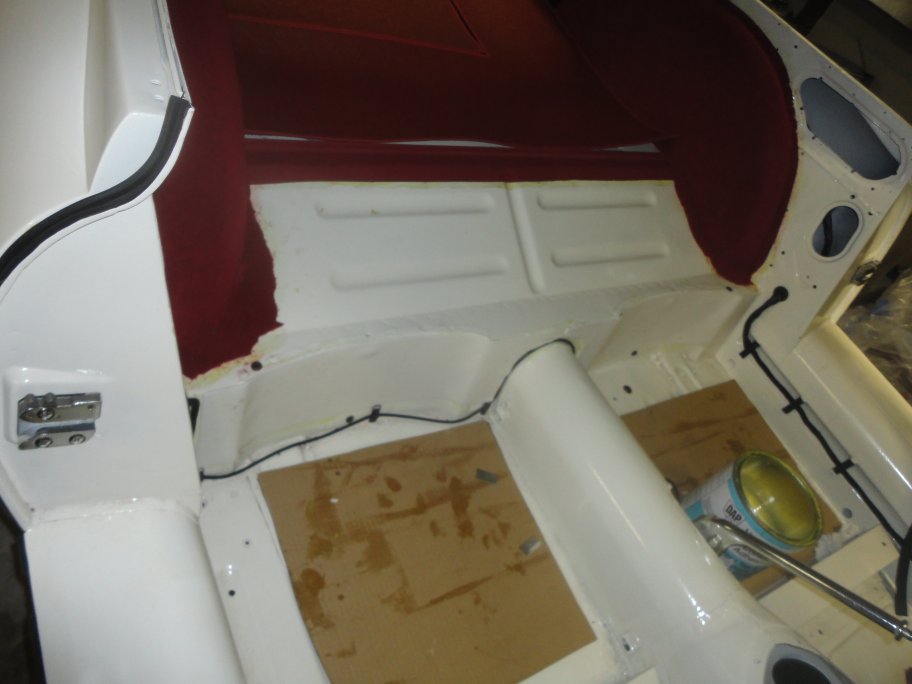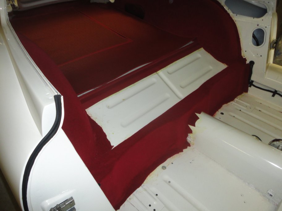 placed without glue. Then starting at the top above the transmission tunnel, contact cement was applied to the back of the mocquette, which was then pressed