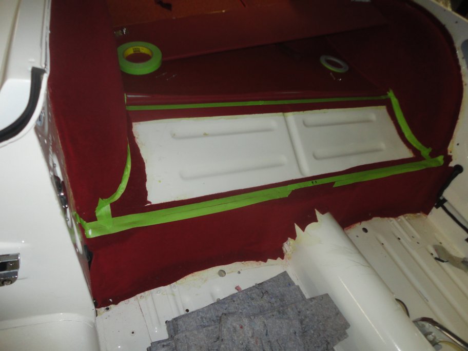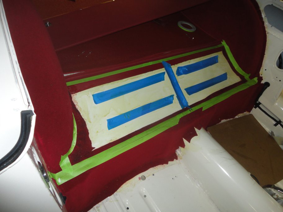 23) Mocquette was applied similar to the wheel arches. The perimeter was masked off, contact cement was brushed on around the outside edges, and the mocquette was