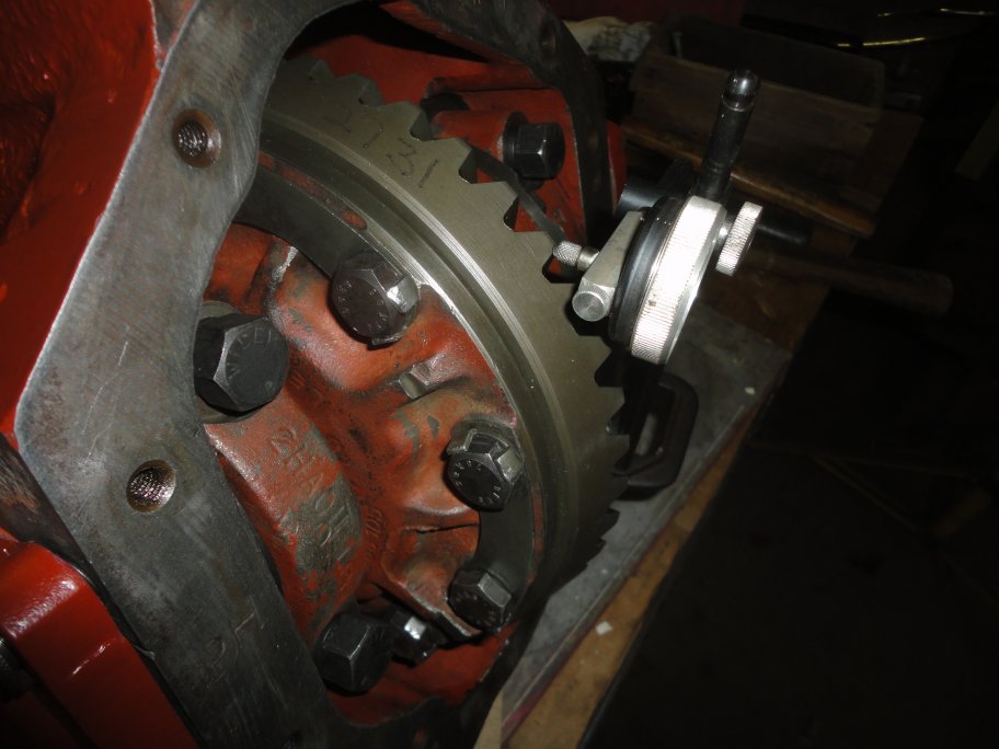 7) A dial indicator is setup contacting a tooth on the crown gear. The crown gear is